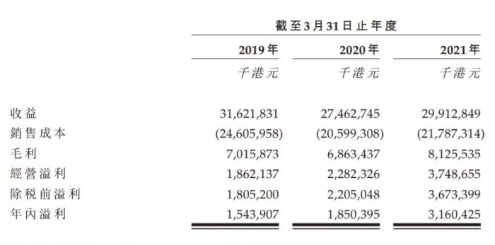 截至2019年、2020年及2021年3月31日止年度,原材料成本分别为135.49亿港元、90.41亿港元及92.44亿港元,分别占公司销售成本总额的55.1%、43.9%及42.4%。