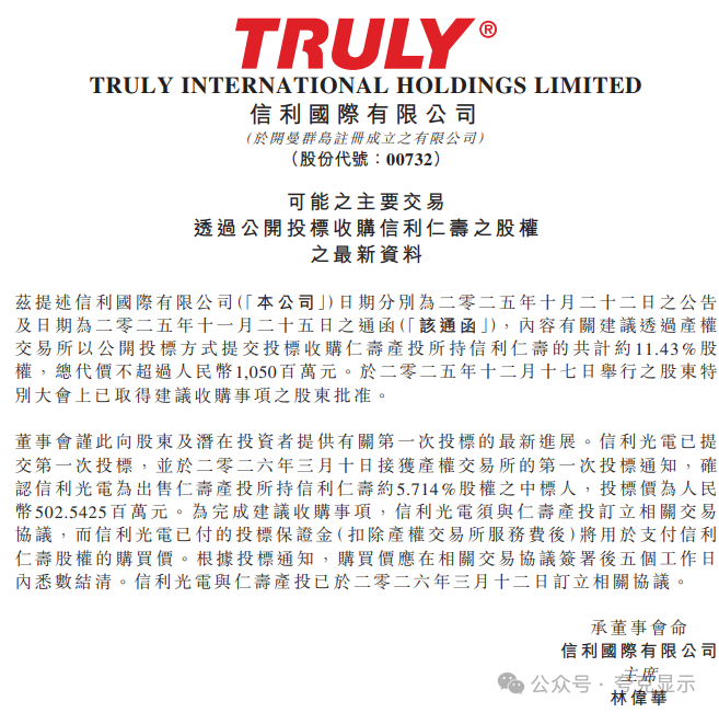 公告显示,信利国际分别于2025年10月22日、2025年11月25日公告,内容有关建议透过产权交易所以公开投标方式提交投标收购仁寿产投所持信利仁寿的共计约11.43%股权,总代价不超过人民币10.5亿元。于2025年12月17日举行之股东特别大会上已取得建议收购事项之股东批准。