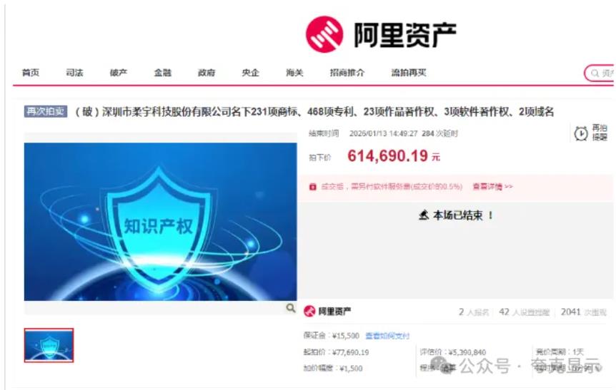 1月26日消息,阿里拍卖平台显示,深圳市柔宇科技股份有限公司(以下简称柔宇科技)核心无形资产以61.47万元成交。拍卖资产涉及柔宇科技名下231项商标、468项专利、23项作品著作权、3项软件著作。