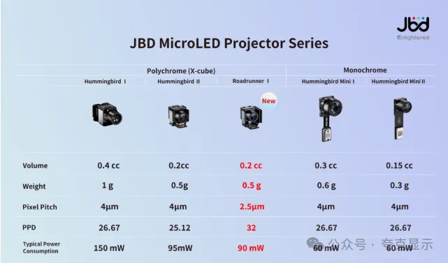 JBD表示,随着“走鹃Ⅰ”的发布,公司已形成“蜂鸟”系列(聚焦主流轻量化市场)与“走鹃”系列(聚焦极致视觉性能)的双产品线矩阵。目前,“走鹃Ⅰ”彩色光引擎已正式开放送样。未来,该系列将基于2.5微米技术平台持续迭代,推出更多覆盖不同分辨率与视场角的显示方案。
