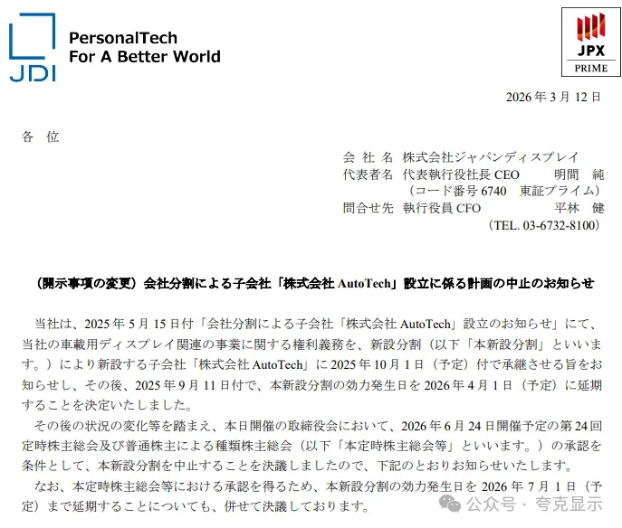 3月12日,日本显示技术公司(Japan Display,简称JDI)宣布,公司决定中止原定通过公司分割设立子公司「株式会社AutoTech」的计划。该决策将在公司董事会批准后正式生效,预计将在2026年6月24日举行的股东大会上获得批准。