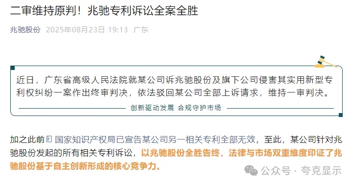 8月23日,兆驰股份(002429.SZ)在公司微信公众号发文表示,某公司针对兆驰股份发起的所有相关专利诉讼,以兆驰股份全胜告终。