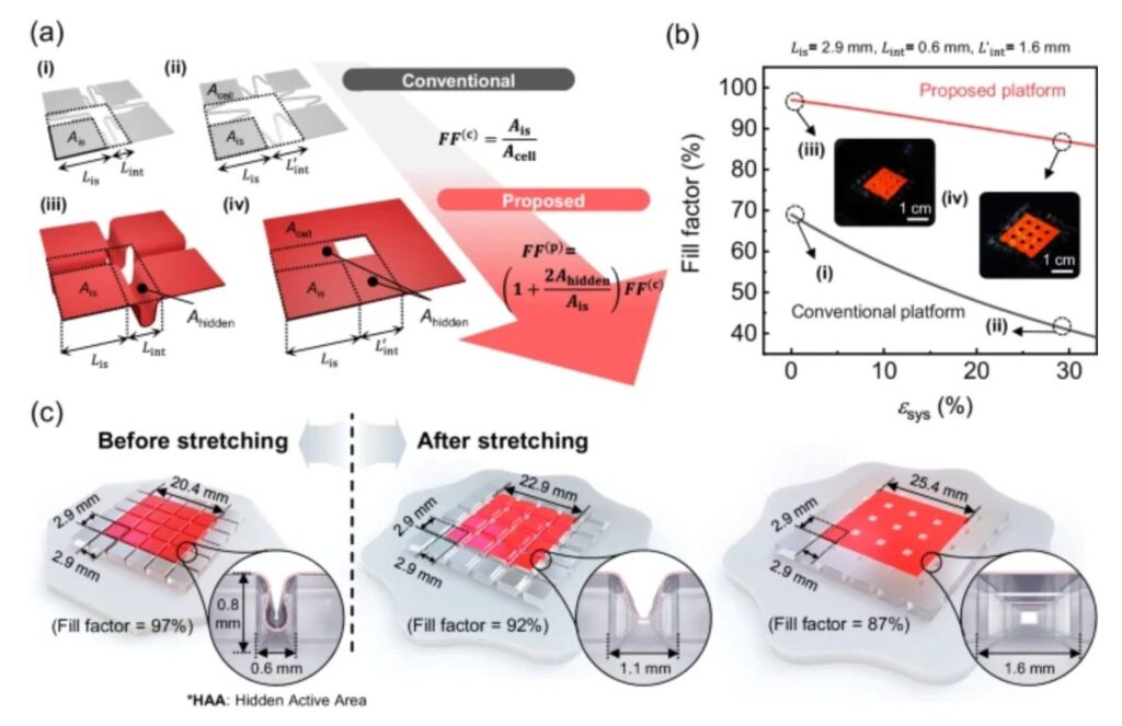 近日,来自韩国科学技术院(KAIST)、ETRI和东亚大学的研究人员提出了一种新的可拉伸OLED显示架构,该架构基于3D形式,包括既充当有源发射区域又充当互连器的隐藏部分。该设想是,随着OLED显示器的拉伸,这些区域会弹出到位并增加OLED的发光区域。这些区域基本上是隐藏的像素,仅在显示器拉伸时使用。