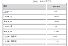 4月9日,友达光电公布2026年3月自行结算合并营收为新台币260.2亿元,较上月增加26.9%,与去年同期相比增加0.6%。 累计2026年第一季合并营业额为新台币690…