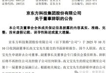 10月10日,京东方A(000725.SZ)公告称,公司于2025年10月10日收到副董事长高文宝的书面辞职报告,高文宝因个人原因申请辞去公司董事、副董事长及董事会专门委员…