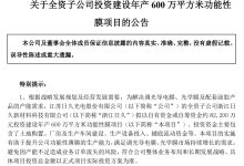 6月27日,江苏日久光电股份有限公司(以下简称“日久光电”)发布公告称,公司全资子公司浙江日久新材料科技有限公司拟以自有资金或自筹资金约8.22亿元投资建设年产600万平方…