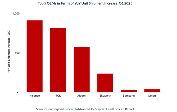 依托中国内需市场,中国电视厂商迅速增加了高端电视的出货量。2025年第一季度,海信和TCL在高端电视市场的出货量增长率达到了三位数。海信在这一季度的高端电视市场出货量份额从去年14%提升至20%,TCL的份额也从13%增至19%;与此同时,海信的销售额份额从13%增至17%,TCL从13%增至16%。