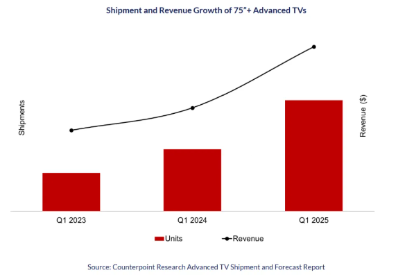 据市场研究公司Counterpoint Research最新数据显示,今年第一季度高端电视市场的出货量较去年同期增长了44%,同期销售额增长了35%。这一增长趋势主要由中国电视市场推动,尤其是海信、TCL等中国电视厂商通过Mini LED电视加强了高端电视市场的营销。