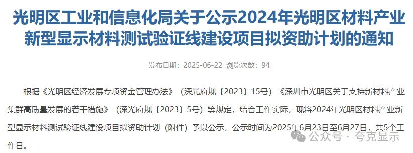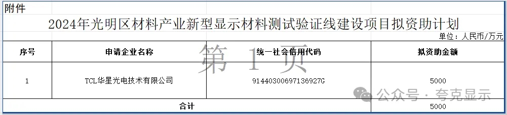 6月22日,深圳市光明区工业和信息化局公示,2024年光明区材料产业新型显示材料测试验证线建设项目拟资助计划名单,TCL华星光电技术有限公司获得拟资助金额人民币5000万元。