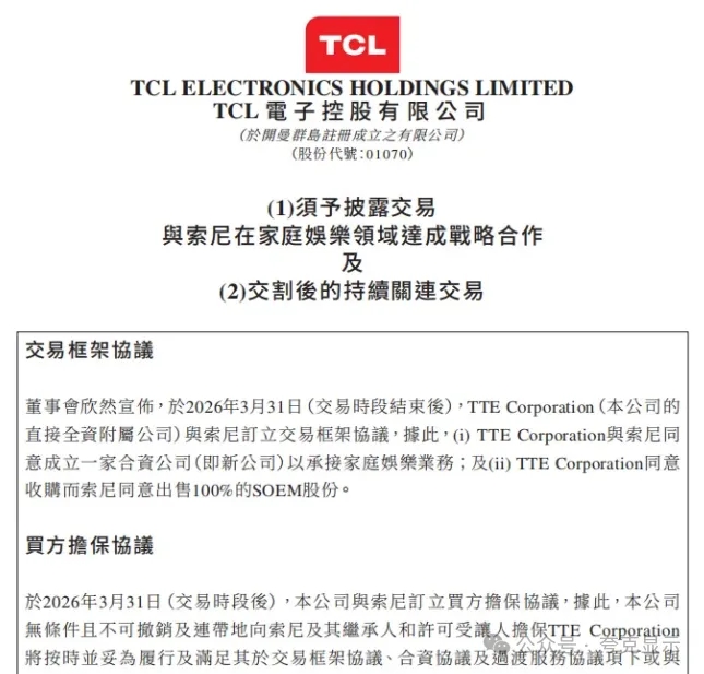 3月31日,TCL电子发布公告称,公司以约37.8亿港元现金,与索尼成立合资公司,并收购索尼马来西亚子公司SOEM,以承接索尼的家庭娱乐业务(主要为电视产品的开发、制造以及销售)。根据协议,新公司将由TCL电子持有51%股权,索尼持有49%股权。