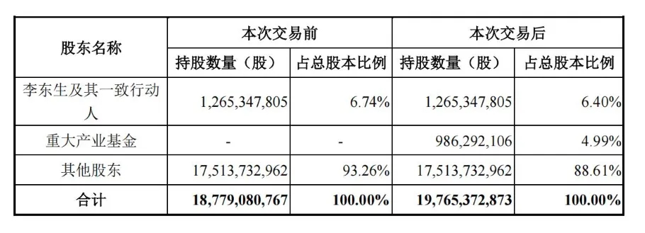 此次交易完成后,深圳市重大产业发展一期基金将成为TCL科技的主要股东之一,持股比例为4.99%。TCL科技董事长李东生及其一致行动人合计的持股比例将由交易前的6.74%稀释至6.40%,但继续保持第一大股东地位。在股权结构方面,TCL科技仍将保持无控股股东及实际控制人的股权结构。