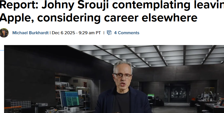据彭博社12月7日报道显示,苹果硬件技术高级副总裁约翰尼·斯鲁吉正“认真考虑”离职,这位苹果自研芯片的核心推动者若最终出走,将成为短期内第五位官宣离开的苹果高层。